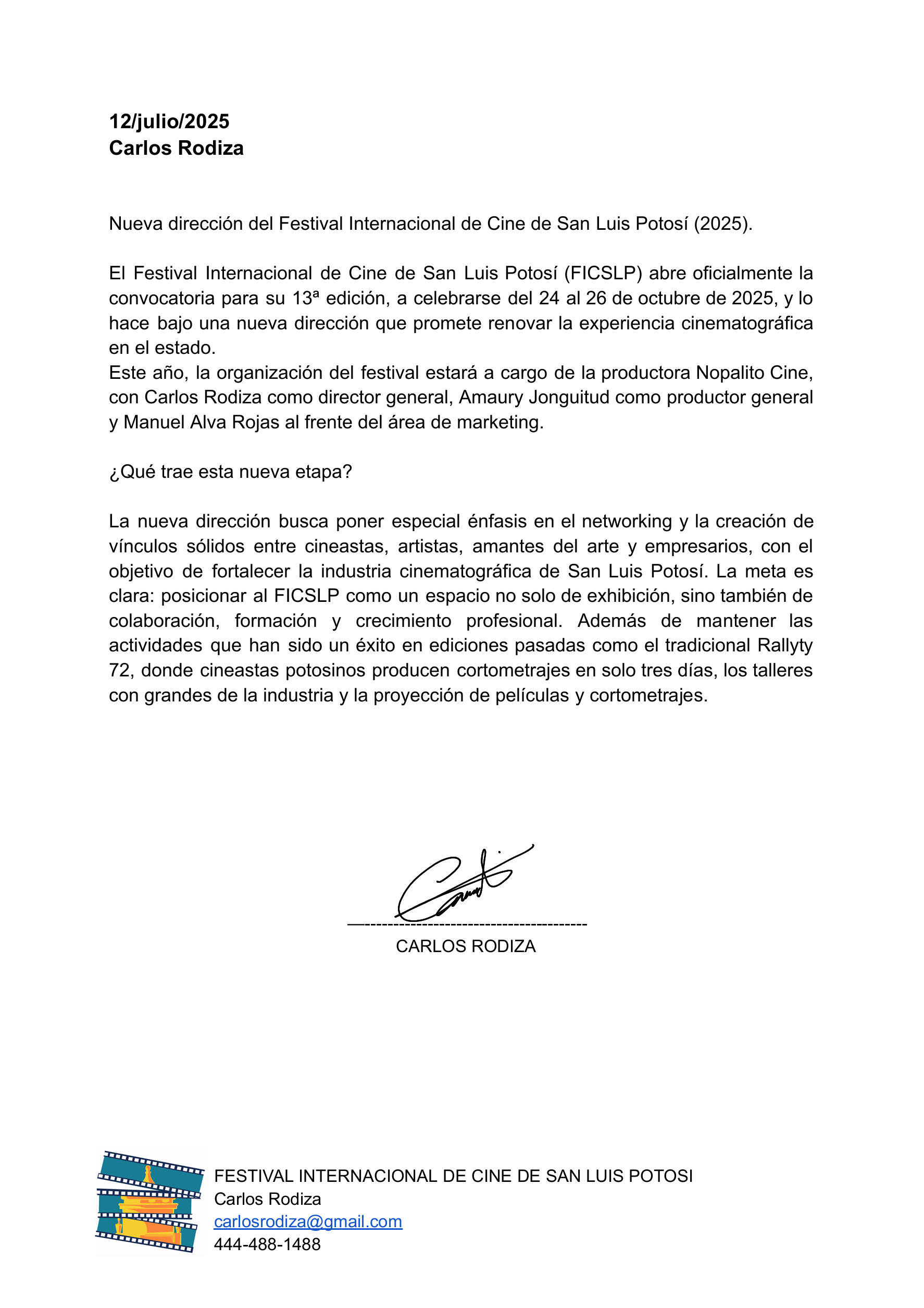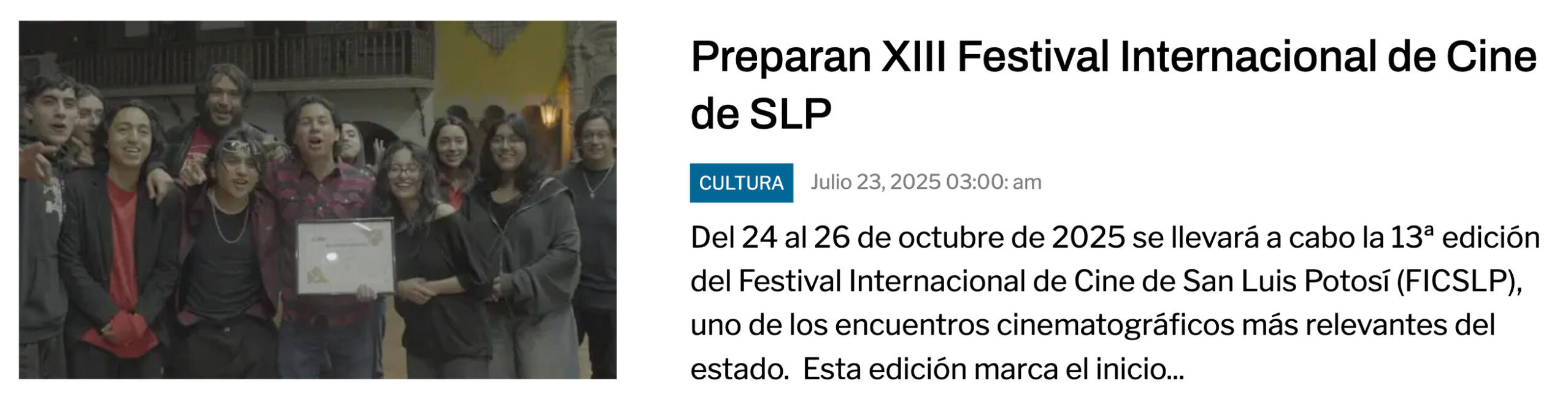 El Festival Internacional de Cine de San Luis Potosí ha cerrado con broche de oro su decimotercera edición, celebrada con gran entusiasmo del 24 al 26 de octubre de 2025.Fue una gran celebración cinematográfica donde, una vez más, rendimos homenaje al talento nacional e internacional, e impulsamos con orgullo el cine hecho en San Luis Potosí.Agradecemos profundamente a todos los cineastas, participantes y al público por hacer del FICSLP 2025 un éxito rotundo e inolvidable.